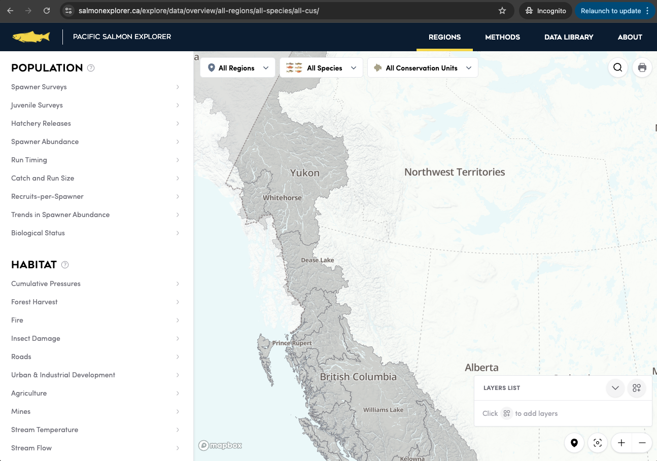 The Pacific Salmon Explorer is a novel online data visualization tool where information about salmon CUs and their habitats is freely and publicly available. The Pacific Salmon Explorer was built by Periscopic Inc. using HTML5 technologies and is driven by a PostgreSQL database developed and maintained by PSF staff. The Pacific Salmon Explorer was initially launched in June 2016, including only the Skeena Region. Since the Pacific Salmon Explorer was developed with extensibility in mind, we added additional Regions to the tool (see Section 5. Regions: Specific Data, Methods, and Results. We will continue to add additional Regions to the tool until all salmon CUs in BC and the Yukon are included.